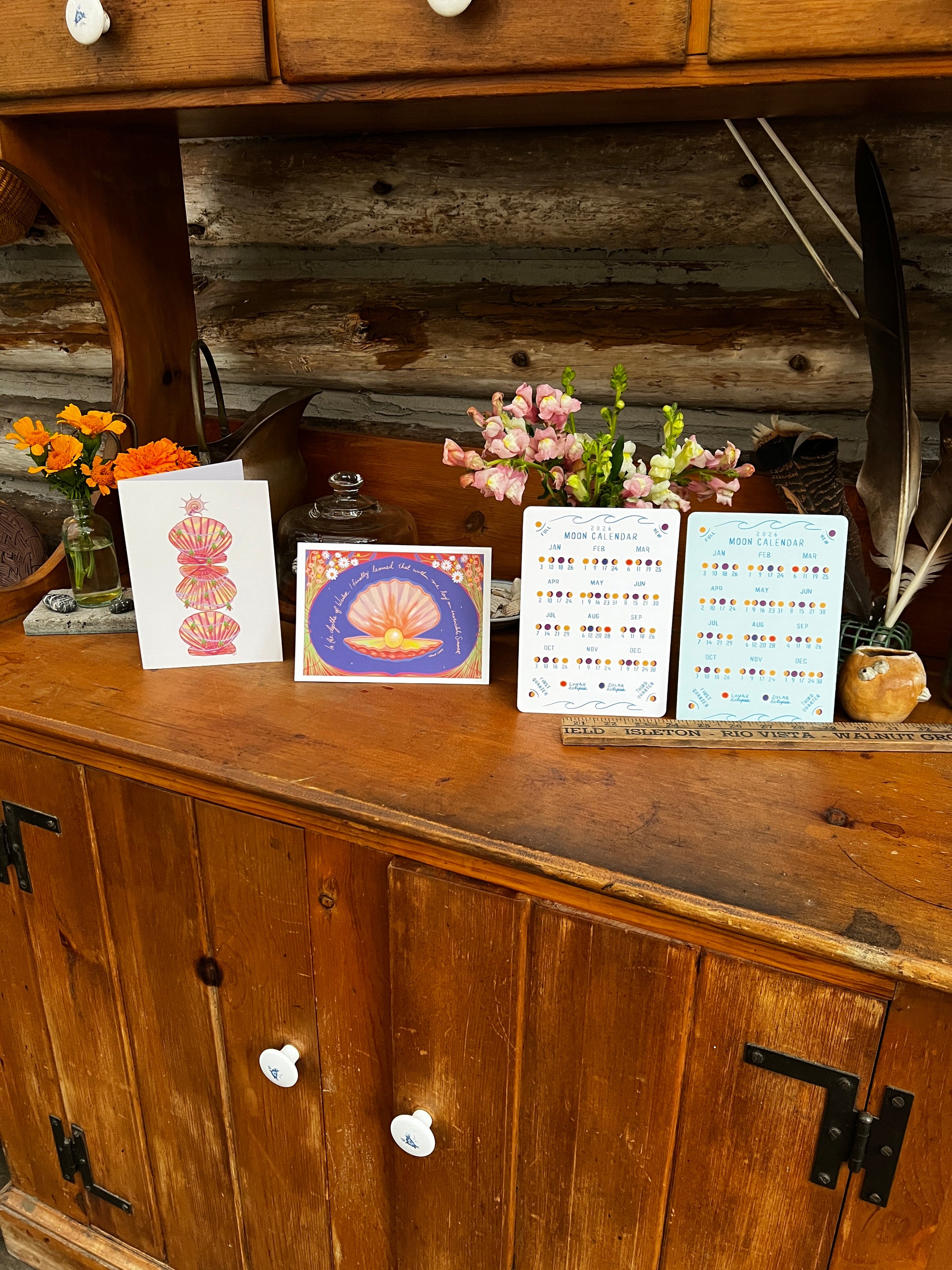 5x7 illustration printed on heavy weight hemp paper with rounded corners and signature logo on back. Comes in two different colors, white or mint.